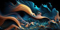 Dit schilderij laat de kracht van de natuur zien door de golven die zich eindeloos voortbewegen in een golvend patroon van kleiachtige materialen. De kleuren zijn rustig en donker, waardoor het werk een gevoel van kalmte uitstraalt.