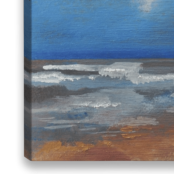 Met olieverf ontstond dit intense zeegezicht: Het blauw contrasteert met het oker op de voorgrond. De wolken hangen boven de golven alsof er sprake is van een echo. De zon is niet zichtbaar maar het rood op de voorgrond en op de achtergrond laten iets van de warmte van het licht doorschemeren.