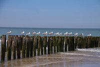 Zeemeeuwen rusten op de golfbrekers die in de Noordzee staan op het strand in Zeeland. Mooie zomerse dag met blauwe lucht