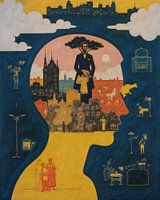 Deze collage gaat over mijn onderzoek naar stedelijke identiteit en de manier waarop het individu en de stad waarin ze leven op elkaar inwerken. Het hart van het werk wordt gevormd door de omtrek van een mannenhoofd, dat je kunt zien als een vat met een persoonlijk verhaal en ervaring, gevuld met een gedetailleerde tekening van een…