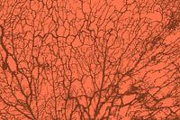 Een afbeelding in Scandinavische stijl van een bos met bomen en takken in abstracte bruine lijnen op krachtig koraalrood. Hier kunt u het ook in andere trendy kleuren kopen.