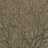 Een afbeelding in Scandinavische stijl van een bos met bomen en takken in abstracte groene lijnen op een okergele achtergrond.