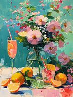 De zomer in je bol, fijn zomers "plaatje". Een uitbundige bos veldbloemen met fruit en cocktails op de voorgrond. Voor iedereen die zin heeft in de zomer en vakantie!