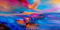 Men verlangt ernaar op deze plaats te zijn aangekomen en hier een tijdje te mogen blijven. Het weidse heldere landschap opent zich naar een verre horizon, de wolken glanzen in warme kleuren, de turkooisblauwe hemel laat zich zien. Alles wordt weerspiegeld in het water, de abstract geschilderde kustgedeelten nemen de beige, turquoise, blauwe en roze kleuren van de lucht over. Herinneringen aan zorgeloze vakantietijden worden opgewekt.