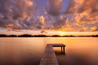 De zon gaat onder boven het Paterswoldsemeer op een mooie avond met een prachtige wolkenlucht. Een serene en vrolijke foto met mooie kleuren. De contrasten tussen warme en koele kleuren geven de foto wat extra.