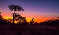 De zon gaat onder in de Kalahari woestijn, met silhouet van giraffes van Rietje Bulthuis