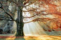Grote beuk in de zonnestralen. De schoonheid van de natuur ligt vaak dichterbij dan je denkt. De frisse vroege ochtend met de nog vochtige lucht geeft mooie zonnestralen in het bos. Gratis en voor niets.