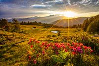 De zonnestralen raken de alpenrozen op de Lackenalm en toveren een prachtig licht tevoorschijn.