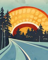Retro style abstract landschap met een straat met bomen aan weerszijden, die naar de ondergaande zon leidt. De vlekken op de zon zijn geinspireerd door de vlekjes, die je soms ziet als je net te lang in fel licht hebt gekeken.