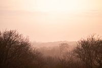 Na een koude nacht dampt het bos van duingebied Meijendel. De opkomende zon zet het landschap in een warme gloed.