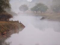 landschaps/natuur foto genomen in een natuurgebied in Holland, vroege ochtend foto van een zwaan in de ochtendmist. Sfeervol beeld van een Hollands landschap.