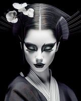 Deze foto straalt een diepe, bijna mystieke rust uit. De geisha, met haar smetteloos witte gezicht en scherp omlijnde ogen, slaat haar blik nederig neer en straalt een spookachtige stilte uit. De zwarte, bijna grafisch getekende oogmotieven, die zich uitstrekken van haar gesloten ogen tot haar slapen, geven haar een ongenaakbare maar…