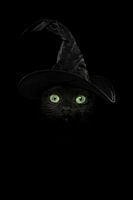 Portret van een zwarte kat met groene ogen en een heksen hoed