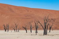 Dode bomen op de zoutvlakte genaamd Deadvlei tegen een grote rode zandduin met daarboven de stralend blauwe lucht. Deadvlei ligt in Namibie en is te bereiken vanuit Sesriem. Deze lokatie heeft jaren op mijn lijst gestaan om te gaan bezoeken, omdat dit een hele onwerkelijke omgeving is waar je helemaal in op kunt gaan. Werkelijk prachtig.