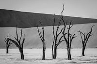 Abstracte foto van de dode bomen in Deadvlei (nabij Sossusvlei) in Namibië in zwart-wit.