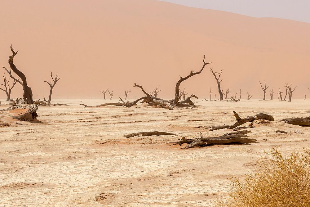 Deadvlei is een witte kleivlakte nabij Sossusvlei in het Namib-Naukluft Nationaal Park in Namibië