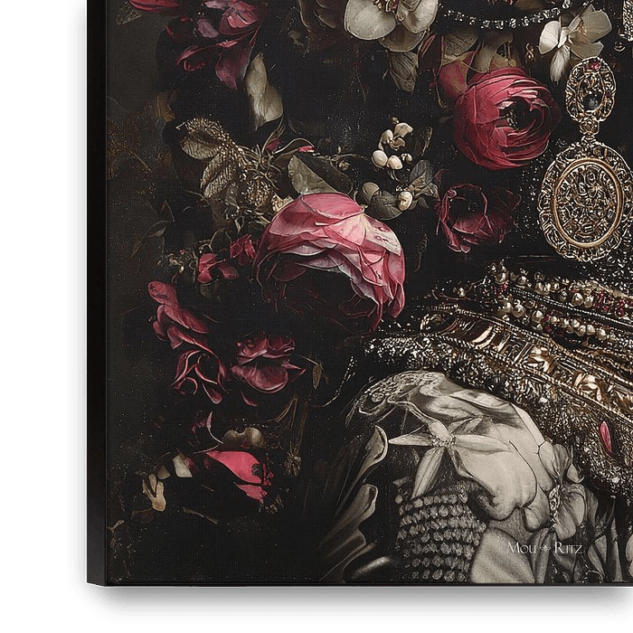 De afbeelding toont een kunstig versierde menselijke schedel, omringd door een weelderige kroon van bloemen, parels en gouden ornamenten. Teder bloemen in warme en donkere tinten lijken de schedel liefdevol te omhelzen, alsof ze hem nieuw leven inblazen. Sieraden en bloemenelementen versmelten tot een stil portret vol gratie, dat…