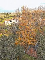 Een fotokunstbeeld van een oude boerderij op een heuvel, omgeven door olijfbomen en bossen. Het is december in Umbrië en de bladeren verkleuren in deze tijd van het jaar - veel later dan de gebruikelijke herfsttijd vanwege het milde klimaat. De boom die het huis gedeeltelijk verbergt is bedekt met gele en gouden bladeren.