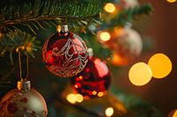 Glinsterende kerstballen in dieprood en goud schitteren verleidelijk in het warme licht van een kerstboom. Hun filigraanpatronen vertellen over feestelijke vreugde, terwijl vage lichtpuntjes op de achtergrond een gezellige sfeer creëren. Het is een moment vol magie en verwachting dat de magie van de feestdagen ontvouwt.