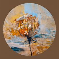 Schilderij in warme tinten met goudkleurige accenten van uitgebloeide wilde peen in ronde vorm.