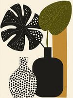 Dit ongewone decoratieve stilleven toont een minimalistische en gestileerde voorstelling van twee vazen en twee grote bladeren. De linker vaas is wit met zwarte stippen, terwijl de rechter vaas helemaal zwart is. De bladeren zijn ook gestileerd: het linkerblad is zwart met witte stippen en heeft een monsterachtige vorm, terwijl het rechterblad olijfgroen is met witte stippen en een meer ovale vorm heeft. Op de achtergrond staat een verticale, rechthoekige streep in een warme gele kleur. De hele compositie is afgebeeld op een crèmekleurige achtergrond. Het gebruik van contrasten en eenvoudige vormen maakt de foto visueel aantrekkelijk en modern. Stilistisch kan het worden gecategoriseerd als minimalistisch en modernistisch. Het gebruik van eenvoudige vormen, duidelijke lijnen en contrasterende kleuren is typerend voor deze stijlen. Het doet denken aan het werk van kunstenaars als Henri Matisse, vooral zijn late silhouetten, en Piet Mondriaan met zijn geometrische composities en heldere kleurvlakken. Ellsworth Kelly en zijn minimalistische, kleurintensieve werken kunnen ook als inspiratie hebben gediend.