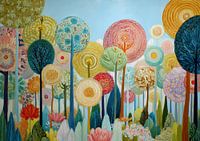Decoratieve Bomen | Playful Tree Universe - Dit kleurrijke schilderij toont een speelse verzameling van bomen met ronde, decoratieve bladeren en bloemen die samen een levendige, vrolijke sfeer creëren, perfect voor een modern interieur.