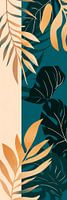 Een harmonieuze compositie van weelderige bladpatronen ontvouwt zich in zachte aardetinten en diepblauw. De filigraanbladeren dansen in warme goudtinten en geven het harmonieuze geheel een tropische elegantie. Deze graphic creëert een sfeer van subtiele luxe waarin natuur en design in perfecte harmonie samensmelten.
