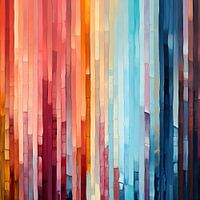 Dit kunstwerk is een levendige explosie van kleuren, bestaande uit een reeks verticale strepen in warme en koele tinten die harmonieus met elkaar dansen. Het begint met diepe, rijke bordeauxrode strepen die geleidelijk overgaan in zachte oranje/roze tinten en warme zonnige goudkleuren. Deze kleuren vermengen zich moeiteloos en vloeien…
