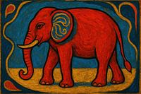 Een felrode olifant met dikke contouren en sierlijke krullen in het oor staat contrastrijk tegen een diepblauwe achtergrond. Subtiele goudgele accenten golven langs de randen en schetsen een speelse, bijna ritmische beweging. De vlakverdeling is eenvoudig en krachtig: een brede zandkleurige strook onderaan draagt het dier, terwijl het…