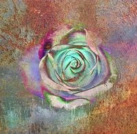 Fotografie van een roos digitaal verwerkt met textuur. Bruine en turquoise tinten domineren het beeld. De textuur ziet er antiek en roestig uit, wat het beeld een nostalgische uitdrukking geeft...nostalgie, vintage, textuur, structuur...