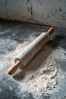 Een rustieke deegrol rust op een licht met bloem bestoven oppervlak, omgeven door de onvervalste sfeer van een vervlogen keukentraditie. Het eenvoudige houten oppervlak straalt warmte uit en roept herinneringen op aan gebak en gedeelde momenten. Een perfecte highlight voor de keuken die uitnodigt tot eetplezier en gezelligheid.