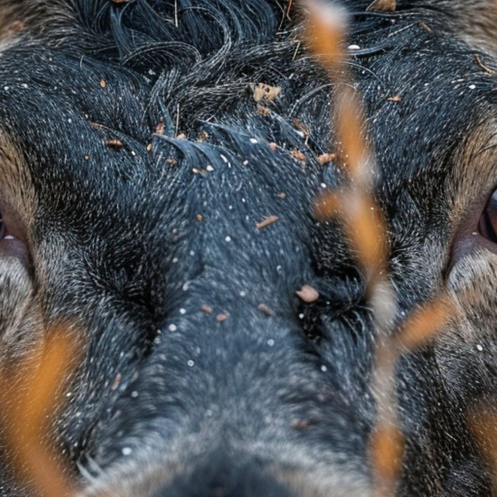 Het dier, onbewust van de buitenwereld, zich overgeeft aan een moment van stille reflectie. De textuur van zijn vacht, bezaaid met dauwdruppels en kleine takjes, is zo levendig dat men bijna de koele bries kan voelen die door het riet waait.
