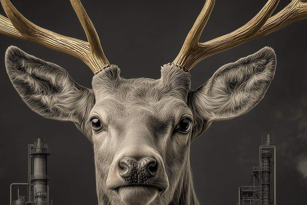 Een edelhert met glanzende gouden gewei prijkt trots voor een industriële achtergrond vol rokende schoorstenen. Een krachtig contrast tussen de zuiverheid van de natuur en de harde wereld van de industrie.