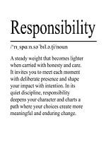 Deze minimalistische typografische poster stelt het begrip verantwoordelijkheid centraal. Het heldere ontwerp en de fijn geformuleerde definitie benadrukken het belang van bewuste beslissingen, houding en persoonlijke verantwoordelijkheid.