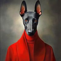 Een iconisch portret van kracht en elegantie: deze dobermann is vastgelegd in een tijdloze compositie die perfect zijn scherpzinnige blik en sierlijke contouren benadrukt. Met zijn glanzende zwart-met-rood vacht en trotse houding straalt dit kunstwerk intelligentie en gratie uit. De subtiele, zachte achtergrond geeft het beeld een verfijnde en moderne uitstraling, ideaal voor elk interieur.