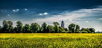 Zicht op het Friese platteland met de kerktoren van Deinum tussen de bomen
