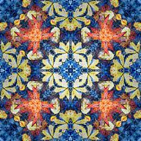 Een caleidoscopisch beeld dat door zijn kleur enigszins doet denken aan traditioneel Delfts blauw aardewerk, en dat gebaseerd is op een foto van bladeren drijvend in een vijver in de herfst.
