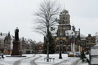 Het Delftse stadhuis op de Markt in de sneeuw met het standbeeld van Hugo de Groot.