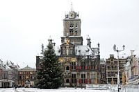 Het MIddeleeuwse stadhuis van Delft in de sneeuw met de kerstboom ervoor op de Markt