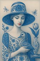 Een dromerig kunstwerk waarin vrouwelijkheid, natuur en Delfts Blauwe elegantie samenkomen. De jonge vrouw straalt rust uit terwijl ze een eend liefdevol tegen zich aanhoudt.