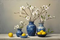 Een verfijnde compositie van diverse Delfts blauwe vazen met felgele citroenen. De combinatie van het klassieke Hollandse blauw met frisse citrus geeft dit kunstwerk een stijlvolle, levendige uitstraling – perfect voor een keuken, eetkamer of lichte ruimte met karakter.