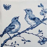Dit is een afbeelding van een Delfts blauw keramiektegel met een traditioneel ontwerp. De tegel toont een fijn getekend tafereel van twee vogels die op een tak zitten, met bloemen en een vlinder die het plaatje completeren. De illustraties zijn uitgevoerd in klassieke blauwe tinten, kenmerkend voor Delfts aardewerk. Het ontwerp straalt een delicate, sierlijke stijl uit, met veel aandacht voor detail en een tijdloze esthetiek.