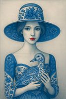 Een sereen kunstwerk dat de rust en verfijning van Delfts Blauw tot leven brengt. De jonge vrouw met haar elegante hoed en zachte gelaat houdt een eend liefdevol in haar armen, omringd door bloemmotieven en een klassieke vaas. De warme uitstraling, het spel tussen traditie en moderne kunst, en de subtiele details maken dit schilderij tot een uniek stuk voor ieder interieur.