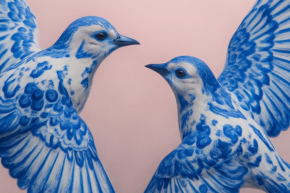 Twee sierlijke vogels in Delfts blauwe stijl lijken te zweven in een tijdloze dans tegen een zachte, roze achtergrond. Een kunstwerk dat traditie en moderniteit moeiteloos met elkaar verbindt.