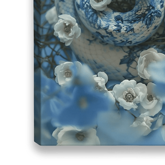 Je ziet een slang met een prachtige symmetrisch 'Delfts Blauwe' print op zijn huid. De bloeiende witte en blauwe bloemen van het kunstwerk zorgen voor een verrassend contrast met de 'Delfts Blauwe' slang. De rijke geschiedenis van het iconische Delfts Blauw aardewerk, komt op een unieke en eigentijdse manier tot uiting in dit kunstwerk.