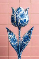 Een stijlvolle porseleinen tulp met klassiek Delfts blauwe bloemmotieven straalt elegantie uit tegen een moderne achtergrond van zachtroze tegels. Deze onverwachte combinatie van traditioneel en hedendaags geeft het kunstwerk een frisse, speelse uitstraling.