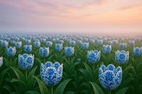 Een eindeloze bloemenzee van Delfts blauw beschilderde tulpen strekt zich uit tot aan de horizon, badend in het zachte licht van een zonsopkomst door de mist. Deze dromerige compositie is een ode aan Nederlandse traditie met een surrealistische twist.