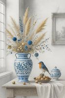 Een sfeervol stilleven van een Delfts blauwe vaas gevuld met een rijk boeket van gedroogde bloemen en grassen. Op tafel ligt een schaal met walnoten en zit een roodborstje, wat het kunstwerk een levendige en huiselijke uitstraling geeft. Perfect voor een klassiek of landelijk interieur.
