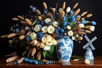 Een rijk voorjaarsboeket met blauwe tulpen, korenaren, witte rozen en zachte droogbloemen in een sierlijke Delfts blauwe vaas. Aan de zijkant een miniatuurmolen, een roodborstje en een deegroller – een speelse knipoog naar nostalgische Hollandse gezelligheid.
