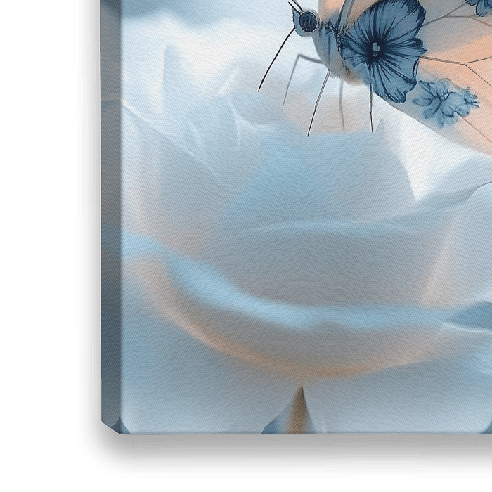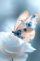 Deze 'Delfts Blauwe Vlinder' op een witte roos is een prachtige aanvulling op ieder interieur en maakt deel uit van een serie. Of het nu een nostalgische link heeft naar de rijke kunstgeschiedenis van Nederland, of gewoon een fascinatie voor vlinders en Delfts Blauw. Dit werk zal zeker de aandacht trekken. Haal een stukje Nederlandse kunst en cultuur in huis met dit bijzondere en opvallende kunstwerk! Dit 'mixed media' kunstwerk is opgebouwd uit fotografie, AI en fotobewerking software.